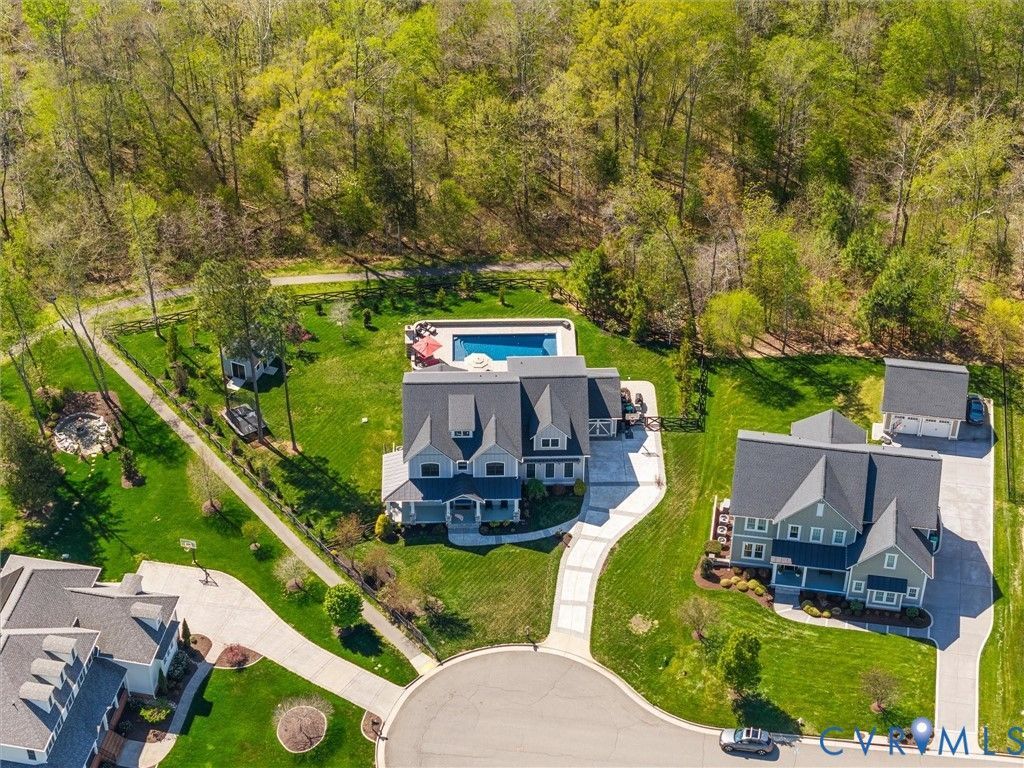 Welcome home to this exceptional luxury residence in award-winning Hallsley, where thoughtful design meets resort-style outdoor living. Built in 2017, this 4-bedroom, 3.5-bath home offers elevated finishes, functional spaces, and one of the larger, more private lots in the community. Step outside to a true backyard retreat featuring a fiberglass UV heated/cooled Pool with automatic cover, expansive paver patio, outdoor fireplace with stacked-stone surround, professional landscaping, outdoor lighting, and a 16x14 powered shed-all totaling approximately over $260,000 in upgrades. The property backs to a protected environmental area, providing unmatched privacy and a serene natural backdrop. Inside, the open-concept layout is both inviting and ideal for entertaining. The spacious family room flows seamlessly into a four-seasons porch and a beautifully appointed chef's kitchen featuring a gas cooktop, custom hood, custom cabinetry with pull-out shelving, large granite island, Blanco farmhouse sink with touch-activated faucet, and under-cabinet lighting. A remodeled mudroom with built-ins/study area adds everyday convenience. The first floor also includes a private office and formal dining room, both enhanced with custom plantation shutters. Upstairs, the expansive primary suite offers a true retreat with a spa-inspired ensuite bath featuring dual upgraded vanities, a soaking tub, and a large tiled shower, along with a generous walk-in closet with custom-built closet system. Three additional bedrooms include a Jack-and-Jill bath and a private ensuite bath, perfect for a guest/teen suite or a flexible bonus space. A walk-up unfinished area provides additional storage or future expansion and is currently used as a gym. Complete with a 3rd garage bay and electric car charger, new gutter guards, and close proximity to award-winning schools, shopping, dining, and major thoroughfares-this is a rare opportunity in one of Midlothian's most sought-after communities.